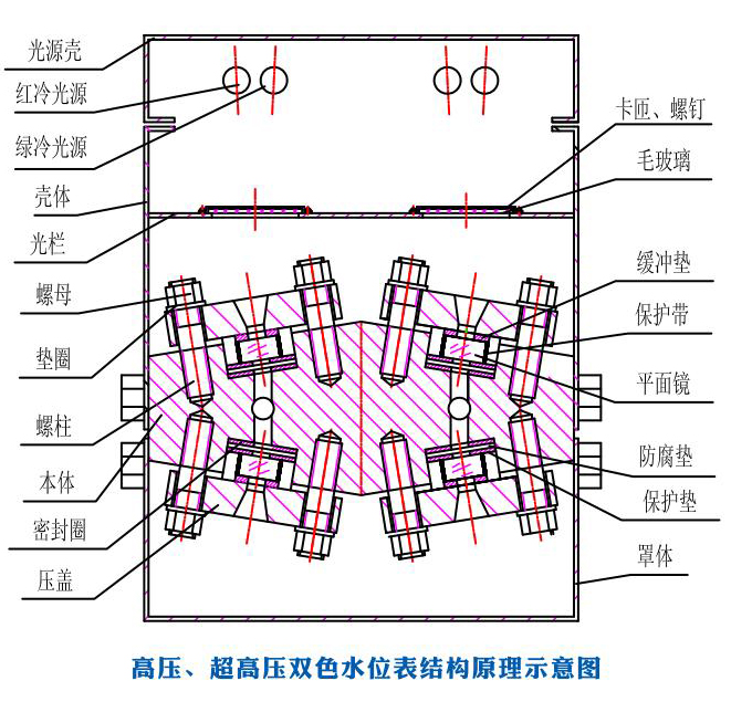 五窗、七窗、九窗水位表觀察孔在表體的兩條直線上,通過將觀測(cè)孔交錯(cuò)組合消除了中間盲區(qū)。由光源發(fā)出的光通過紅、綠濾色鏡片,射向水位表體液腔,在表面內(nèi)汽相部分,紅光射向正前方,而綠光斜射到壁上被吸收。而在表體內(nèi)液相部分,由于水的折射使綠光射向正前方,而紅光斜射到壁上被吸收。因此在正前方觀測(cè)將獲得汽紅、水綠、汽滿全紅、水滿全綠的顯示效果。